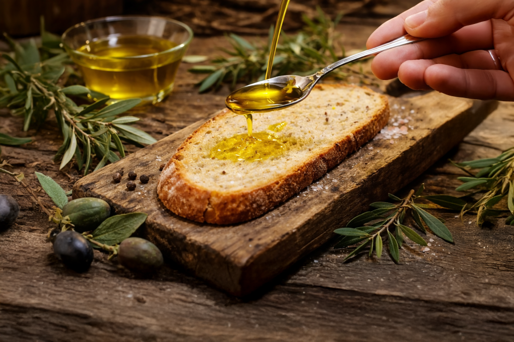 Compagno ideale del pane, per una bruschetta o “crostino”, è l’olio extravergine, garantito dalle denominazioni DOP e IGP e proveniente da qualità di olivo (frantoio, leccino, moraiolo i loro nomi) specifiche di Pienza e della Val d’Orcia. La coltivazione delle piante prima, la raccolta dei frutti e la loro lavorazione dopo, ricevono grande cura, a garanzia della qualità dell’olio, da sempre considerato un prodotto quasi “sacro”, per le sue qualità salutistiche, medicinali, che vanno oltre l’aspetto meramente alimentare.